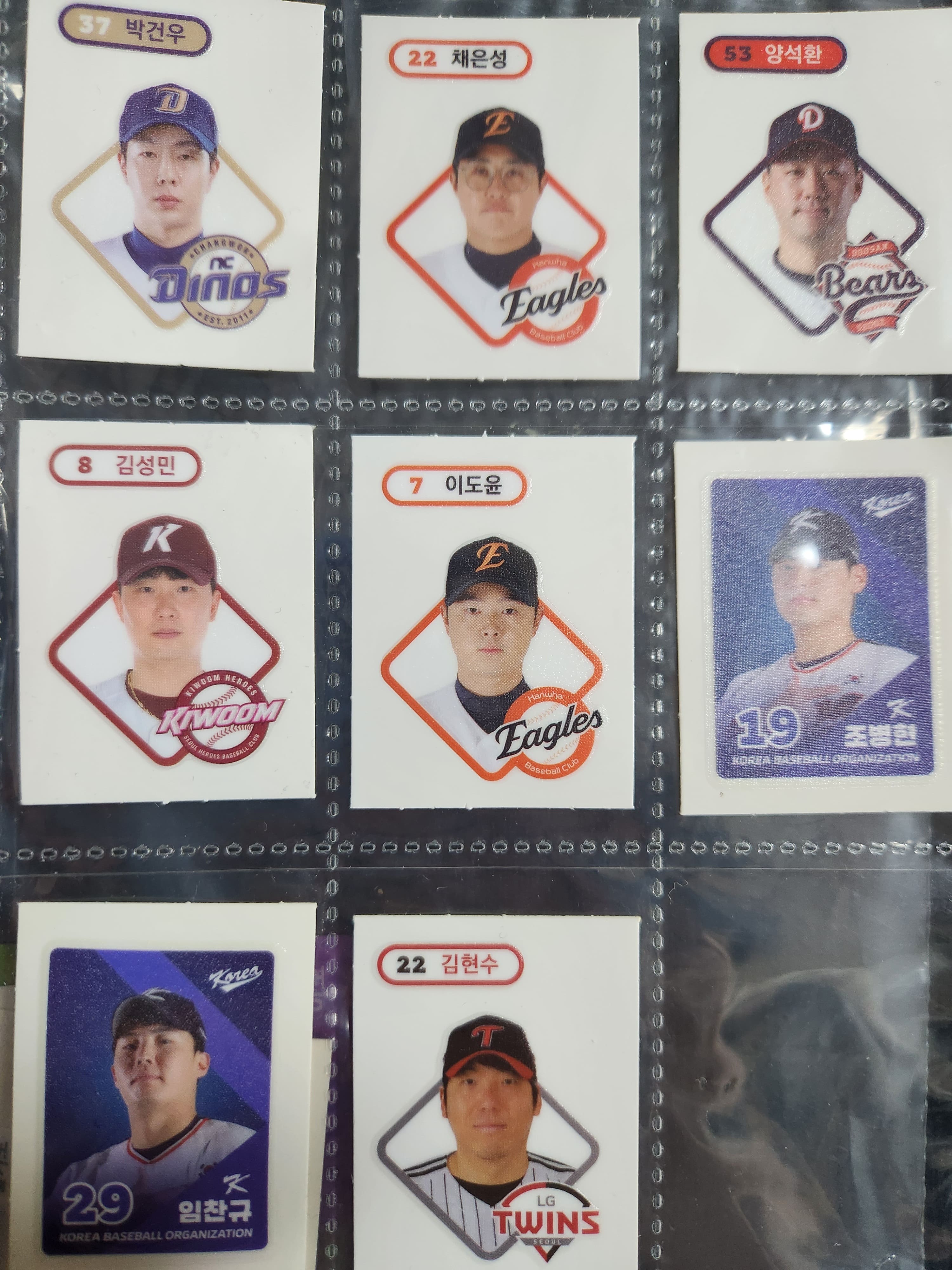 박건우, 채은성, 양석환, 김성민, 이도윤, 조병현, 임찬규, 김현수 선수 띠부씰을 모았어요. 조병현 임찬규 선수는 야구 국가대표 선수입니다.